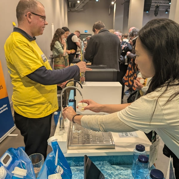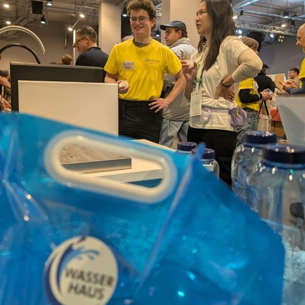 Ein echtes Highlight war unser visueller Vergleich: Zwei identische Gläser Tee – eines mit Berliner Leitungswasser, eines mit Osmosewasser aufgebrüht. Während beim ersten das Motiv unter dem Glas kaum noch zu erkennen war, blieb es beim gefilterten Wasser klar sichtbar. Dieser kleine Test war für viele ein echter Aha-Moment – sogar der Veranstalter zeigte sich begeistert.